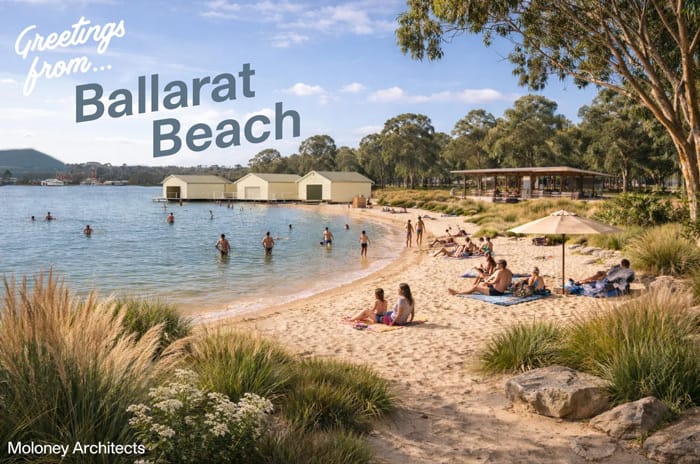 Unless you’ve been hiding in a mine, you’ve probably seen the Lake Wendouree “urban beach” image doing the rounds on social media and even the news. It comes from a speculative study by Moloney Architects, exploring ways the City Oval precinct could better connect with the lake.